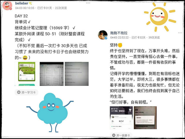 病疫肆虐,在这场没有硝烟的战“疫”中,“云”打卡活动提高了同学们的计划观念和计划能力,此前对学习生活没有规划的同学也开始逐渐养成了良好的生活习惯。18级经济统计学专业的叶晴同学对记者谈到:只要有恒心去做一件事,不管成功与否,都是一件很有收获的事情。正如余世存先生所说‘你的职责是平整土地,而非焦虑时光,你做三四月的事,在八九月自有答案。’