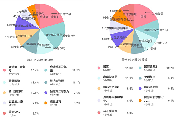 本次活动共有362名学生参与,从软件后台统计的数据来看,连续打卡14天的人数约80%,人均每日学习时长达4小时以上,在随机抽查中发现大部分同学有着清晰的复习思路,能够合理的安排自己的时间。学习总时长排名前十的同学作为期末复习的楷模,分别得到了学院的嘉奖。“云”自习活动为同学们搭建了一个期末复习交流的平台,在疫情期间创造了线上学习互动的良好氛围。参加本次活动的冯凌燕同学表示,疫情期间没有了图书馆和自习室的学习氛围,自己在家复习很难集中精神,而这次活动让我每天可以静心学习,希望这学期成绩能科科变绿。陈郡茹同学则更希望在未来每一个复习周都能参加这类的活动,做个更好的时间管理者。