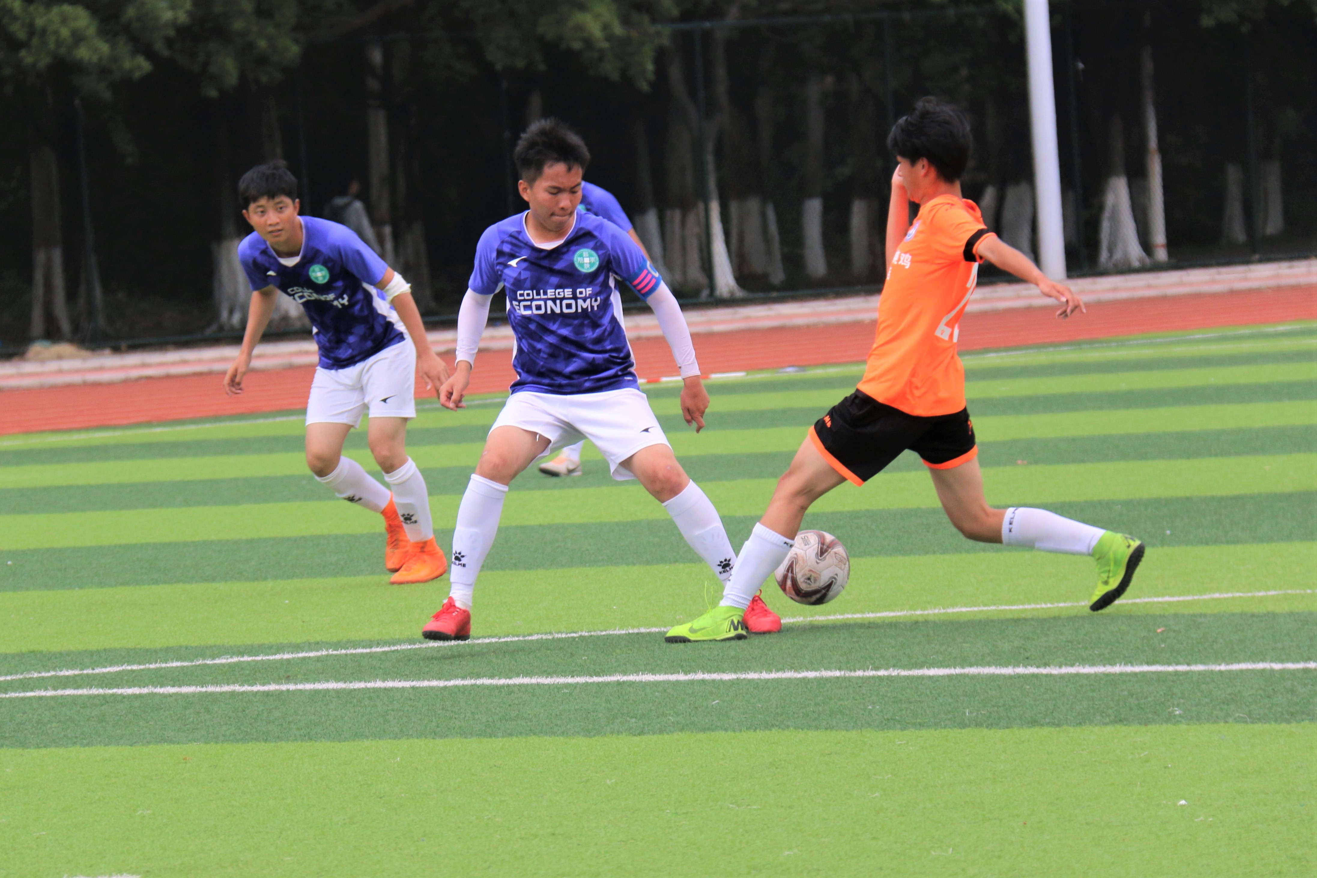 足球赛如火如荼的进行着,迎来了华南理工大学广州学院“雏鹰杯”A组半决赛的开始,身着紫色球衣的伟德国际1949始于英国联队与身着橙色球衣的汽车与交通工程学院联队的比赛在足球场拉开帷幕!