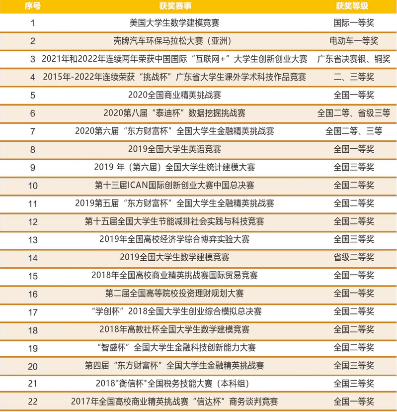 学院现有在校生2198人,多次获得国际级、国家级学术竞赛奖项。2016年荣获第 三届“大智慧杯”全国大学生金融精英挑战赛一等奖、2017年荣获第五届“中金所杯” 全国大学生金融知识竞赛二等奖、2018年美国大学生数学建模竞赛(MCM/ICM)获国际一等奖;2015-2021年连续七年获得了全国高校商业精英挑战赛一等奖、2015年-2022 年连续荣获“挑战杯”广东省大学生课外学术科技作品竞赛二、三等奖、2021年和2022年连续两年荣获中国国际“互联网+ ”大学生创新创业大赛广东省决赛银、铜奖。近三年总体就业率达99.8%以上,20%左右毕业生在世界500强和国内知名企事业单位就职。