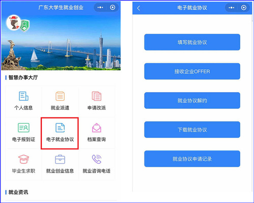 通过“广东大学生就业创业”微信小程序申请《普通高等学校毕业生、毕业研究生就业协议书》(以下简称“电子协议书”)。
