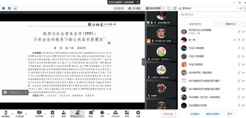 任远向张教授表示了衷心的感谢并对本次线上论坛分享了三点体会。一是,张一林教授从理论层面为同学们解析了什么是新结构金融学,什么是绿色金融,详细分析了新结构金融学切入绿色金融的理论基础、切入点,以及新结构金融学研究基础和发展途径,为同学们展现了金融学领域的最新理论成果。二是,张教授讲座的新视角、新观点、新成果,展示了金融学更丰富、更与众不同的一面,给同学们上了生动一课。三是,张教授讲座不仅仅是在专业领域展现绿色金融发展的道路与前景,更为经院同学们将来从事绿色金融的研究或从事绿色金融的工作提供了新方法、新途径。