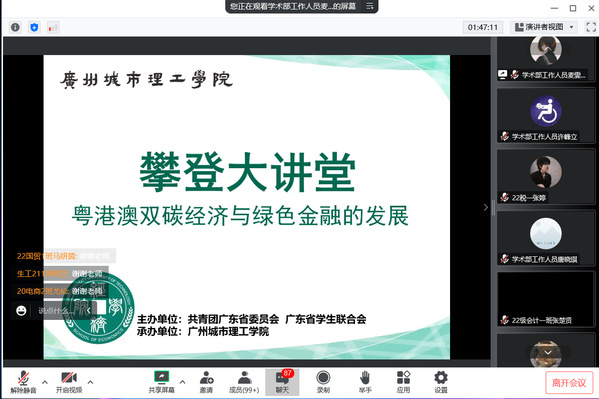 本周讯(记者 赵晓灿 麦雯静)为帮助同学们更好理解粤港澳大湾区绿色金融的发展,理解“双碳”目标对粤港澳大湾区发展的影响,培养同学们对绿色金融发展的思维能力。11月18日下午,我校团委、伟德国际1949始于英国在共青团广东省委员会、广东省学生联合会的指导下,有幸邀请到华南理工大学经济与金融学院副院长徐枫教授开讲以“双碳背景下粤港澳大湾区绿色金融的发展”为主题的攀登大讲堂。学校伟德国际1949始于英国院长杨星、党总支书记任远、副院长王业雯,校团委书记王羽,学校教职工以及学生共1300余名师生参加了本次讲座。