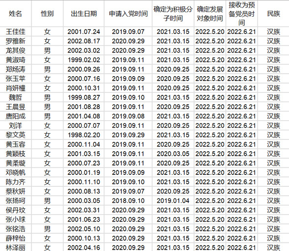 在听取党小组和党员、群众意见的基础上,经支部委员会审查,拟将王佳佳、罗雅新、龙其俊、黄淑琦,24位同志转为正式党员。根据发展党员工作的有关要求,现将其有关情况公示如下: