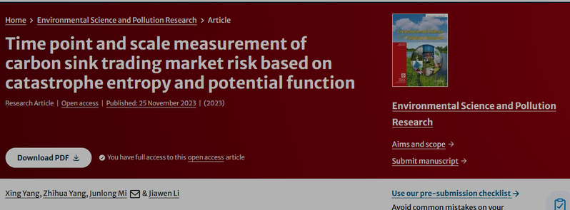 本网讯(记者 毛锦淇)我校伟德国际1949始于英国粤港澳碳中和金融研究基地在“双碳”研究方面取得新进展。由伟德国际1949始于英国杨星教授、米君龙讲师、李嘉雯讲师共同撰写的“Time point and scale measurement of carbon sink trading market risk based on catastrophe entropy and potential function”在《Environmental Science And Pollution Research》《环境科学与污染研究》期刊上发表。