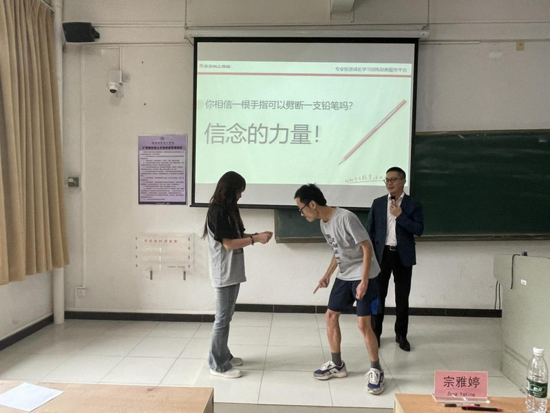 唐天宇总经理以遇见未来的自己为主题就目前的就业环境,阐述了“我们无法左右宏观环境,但自己的微观状态却可以好好营造!”的观点,互动游戏“你相信一根手指可以劈断一支铅笔吗?”同学们踊跃参与,深刻体会到了信念的力量!