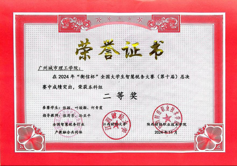 本网讯(记者 张荷芳)11月22日-11月24日,“衡信杯”全国大学生智慧税务大赛(第十届)总决赛在江西财经大学蛟桥园校区成功举办,我校学子在全国舞台上大放异彩,荣获全国二等奖的殊荣,充分展现了我校财税专业的教学实力和学生的综合素质。