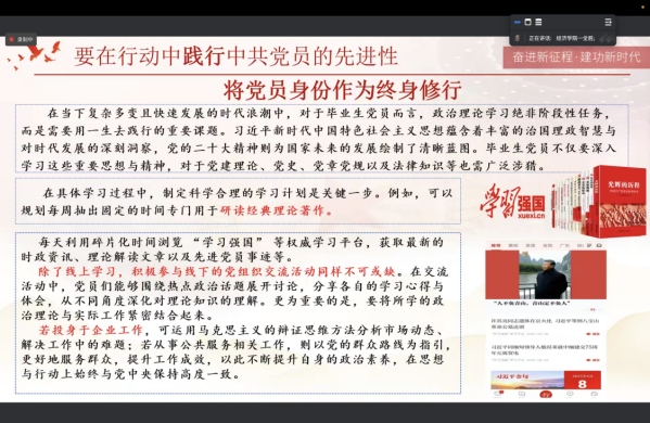 会上,赵晓灿以中央八项规定精神为切入点,进行了深入细致的讲解。她不仅详细阐述了中央八项规定精神的具体条文内容,还对其延伸意义和核心要义进行了深刻剖析。赵老师谈到,中央八项规定精神是党内作风建设的重要准则,其内在要求的拓展和升华,为党员、干部提供了更具普遍性和指导性的行为规范。全体毕业生党员要深入贯彻落实中央八项规定精神,时刻牢记初心使命,以更高的标准严格要求自己,在日常生活和工作中,切实发挥模范带头作用,成为群众的贴心人和引路人。