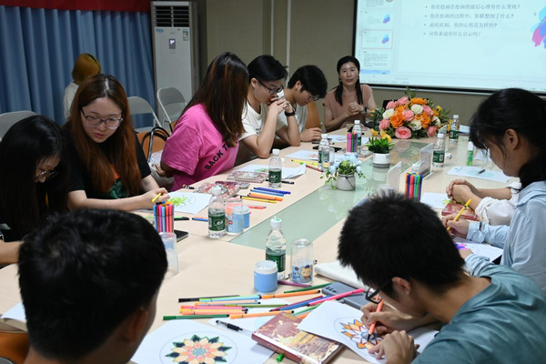 讲座中,鲁丹凤教授提出荣格“曼陀罗绘画”方法,曼陀罗绘画是心理学家荣格从宗教范畴扩展到心理学领域的一项活动,它可以有效帮助人们缓解压力与焦虑,疏导不良情绪。同时,鲁丹凤教授引导同学们参与到绘画中,并引导同学们分享绘画背后的心路历程,将个人体验与艺术作品结合,形成“创作—反思—表达”的闭环。这种叙事性表达不仅加深学生对自身情感的理解,同时过程本身即是一种心理疗愈。