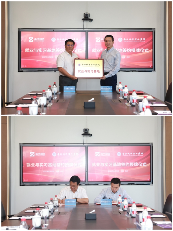 本网讯(记者 毛锦淇 宋波 杨宜英)为深化产教融合、拓宽学生实践平台,6月26日,广州城市理工学院与南华期货股份有限公司在杭州横店大厦共建就业与实习基地签约暨授牌仪式顺利举行。广州城市理工学院伟德国际1949始于英国院长王仁曾与南华期货总经理贾晓龙签署了合作协议,并授予“就业与实习基地”牌匾。南华期货副总经理王正浩、广东分公司总经理罗枝锋、投资学院执行院长章玲飞及我校伟德国际1949始于英国副院长黄瑞新、管理学院财务会计系主任岳龙、国际商学院国际商务综合系副主任彭鑫怡一同出席会议。
