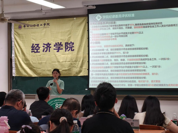 然后,学生会指导老师刘坤钊老师对学生学业预警、绩点要求、纪律考勤及第二课堂等方面进行了详细介绍,让同学们对学业要求、校园纪律以及综合素质发展等方面有了更清晰的认识,有助于同学们将学业要求和纪律规范内化为日常的自觉行动,主动规划大学生活。也有助于营造积极向上的学风氛围。