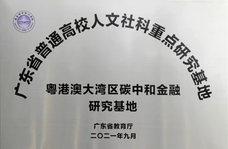 广东省普通高校人文社科重点研究基地“粤港澳碳中和金融研究基地”(Guangdong-Hong Kong-Macao Carbon Neutral Financial Research Base)于2021年9月经广东省教育厅批复成立,是广东省唯一的碳中和金融研究基地。基地以促进低碳绿色发展为目标,旨在建成特色 、省内一流、国内知名、有较强国际影响力的碳中和金融研究基地。